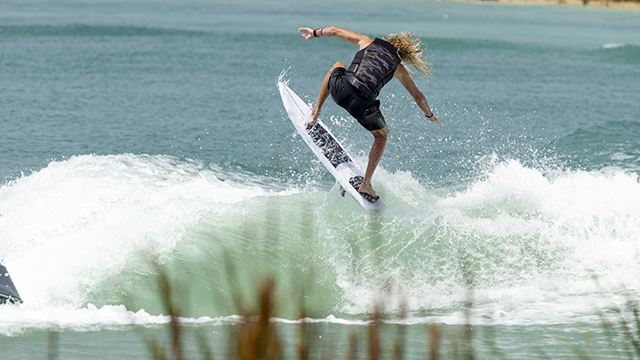 ワイドな設計により、初心者から上級者まで、体重をしっかりと乗せたパワフルなライディングが可能です。波に置いていかれにくい推進力があるため、少し小さな波でも余裕を持ってトリックを仕掛けられます。
